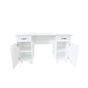 Biroul Dynasty cu 2 sertare si 2 usi este extrem de spatios si elegant. Carcasa biroului este fabricata din PAL melaminat alb cu grosimea de 16 mm, iar usile si fetele sertarelor sunt fabricate din MDF Alb cu grosimea de 18 mm. Usile si fetele sertarelor sunt frezate pentru un aspect elegant, iar blatul biroului fabricat din MDF Alb cu grosimea de 25 mm desavarseste acest aspect elegant, dar asigura si o rezistenta sporita la depozitarea unor obiecte grele pe birou.