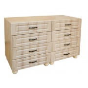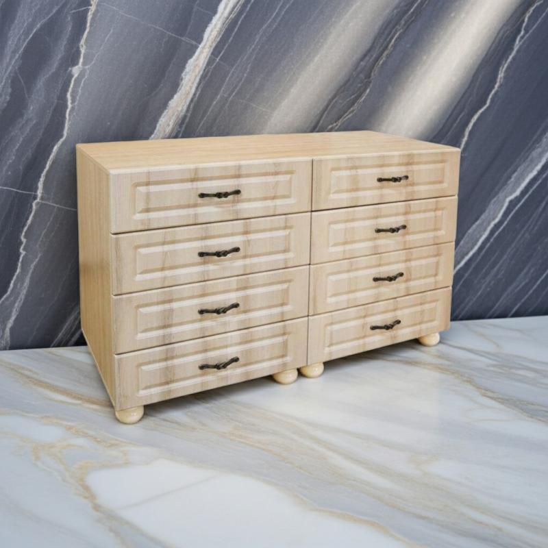 Comoda Dynasty cu 8 sertare este extrem de spatioasa si eleganta. Carcasa comodei este fabricata din PAL melaminat Sonoma cu grosimea de 16 mm, iar fetele sertarelor sunt fabricate din MDF Sonoma cu grosimea de 18 mm. Fetele sertarelor sunt frezate pentru un aspect elegant. Picioarele clasice sunt fabricate din lemn si sunt vopsite, iar manerele metalice antichizate contribuie si ele la aspectul deosebit al comodei. Cele 8 sertare au glisiere cu bile si amortizare pentru o inchidere silentioasa, iar impreuna cu fundurile din PAL melaminat cu grosimea de 16 mm asigura o rezistenta sporita pentru folosirea zilnica a sertarelor. Lungimea comodei este de 1350 mm, inaltimea este de 880 mm, iar adancimea este de 580 mm.