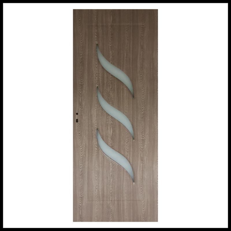 Acest model de usa de interior are 3 ochiuri de geam cu sticla mata, model sinusoidal, dispuse paralel. Culoare gri.