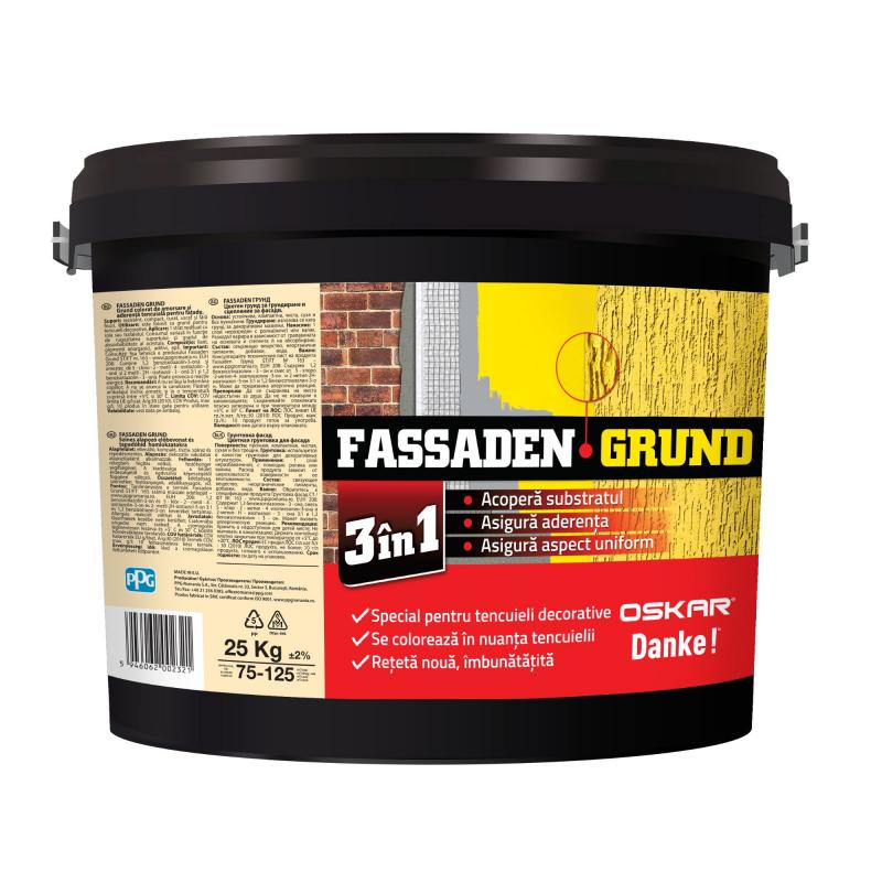 Fassaden grund este un grund structurat special pigmentat, cu aspect mat, ce se utilizeaza pentru pentru reducerea absorbabilitatii suprafetelor minerale si ca strat intermediar de fond si aderenta inainte de aplicarea tencuielilor decorative. Acesta are la baza rasina sintetica in dispersie apoasa si nisip fin de cuart si este disponibil in mii de culori prin nuantare computerizata pe masini de colorat ce folosesc exclusiv retete si pigmenti de colorare de la Deutek.