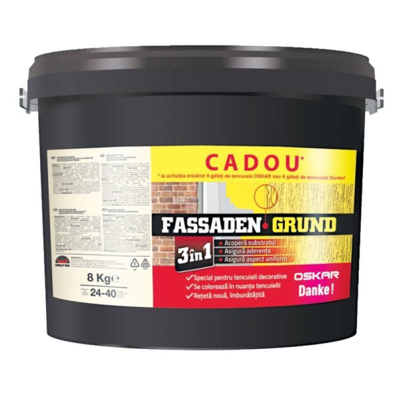 Fassaden grund este un grund structurat special pigmentat, cu aspect mat, ce se utilizeaza pentru pentru reducerea absorbabilitatii suprafetelor minerale si ca strat intermediar de fond si aderenta inainte de aplicarea tencuielilor decorative. Acesta are la baza rasina sintetica in dispersie apoasa si nisip fin de cuart si este disponibil in mii de culori prin nuantare computerizata pe masini de colorat ce folosesc exclusiv retete si pigmenti de colorare de la Deutek.
