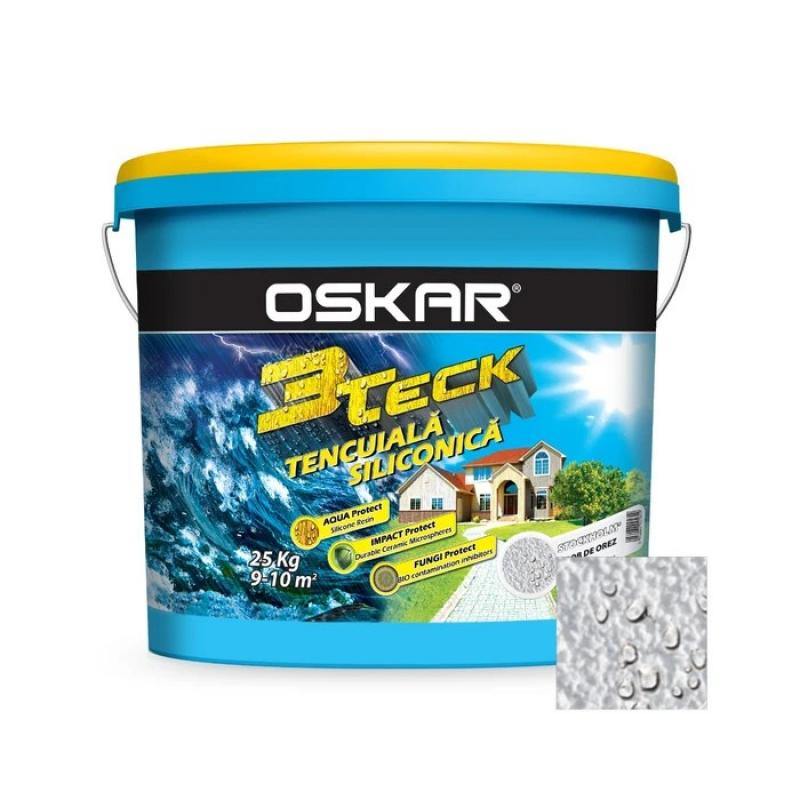 Tencuiala decorativa siliconica Oskar 3 Teck este dura, prezinta un aspect mat si structurat si se utilizeaza pentru finisaje exterioare. Aceasta are la baza rasina acrilo-siliconica in dispersie apoasa aditivata cu microsfere ceramice si agregate minerale cu dimensiunea 1.2 - 1.8 mm. Cu aspect de masa pastoasa, omogena, tencuiala Oskar 3 Teck este disponibila in mii de culori prin nuantare computerizata pe masini de colorat ce folosesc exclusiv retete si pigmenti de colorare de la PPG.